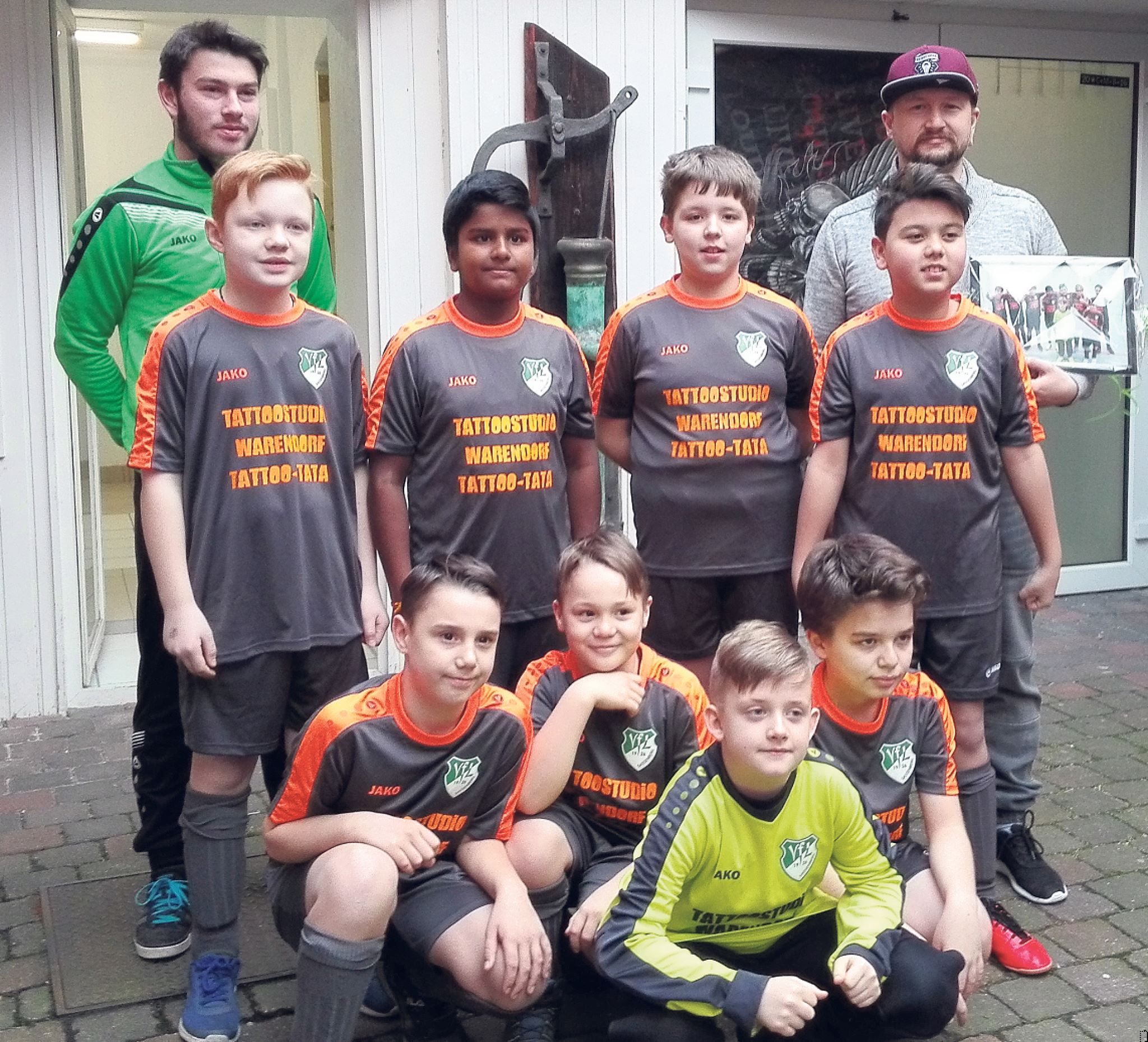 Die VfL Sassenberg U 11 II – Mannschaft und ihr Trainer Marcus Feuchte freuen sich über seinen neuen Trikotsatz, den sie vom Sponsor Eryk Migula (Inhaber des Tattoostudios „Tattoo Tata“ aus Warendorf) erhalten haben. Die Mannschaft und das Trainerteam bedanken sich recht herzlich für diese tolle Spende!