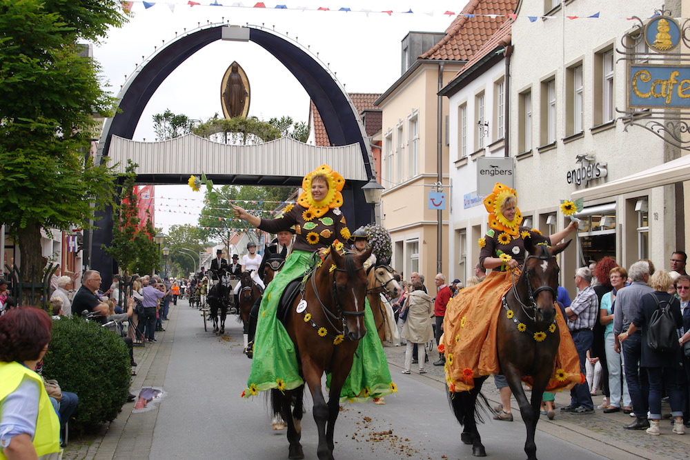 Vor der Abfahrt segnen die Warendorfer Pfarrer jedes Pferd und dessen Reiter oder Fahrer. Dann geht es, angeführt durch den Berittenen Fanfarenzug aus Freckenhorst auf die leicht veränderte Strecke durch die acht Marienbögen, weil ja der neunte, der Bogen auf dem Marktplatz, in diesem Jahr nicht aufgebaut werden kann. Also nehmen die Reiter und Kutschen, darunter festlich geschmückte Landauer mit Verantwortlichen und Vertretern der Stadt sowie den Geistlichen aus Warendorf sowie geladene Ehrengäste 2017 folgenden Weg: Lange Wiese, Dr.- Rau-Allee, Dreibrückenstraße, Emsstraße, Lüninger Straße, Münsterwall, Münsterstraße, Freckenhorster Straße, In den Lampen, Brünebrede, Oststraße, Heumarkt, Krickmarkt, Münsterstraße. Auf dem Wilhelmsplatz wird jedes Gespann bzw. Reitformation von Mike Atig fachkundig vorgestellt und ein kurzer Wortgottesdienst mit musikalischer Begleitung beendet hier die Prozession.