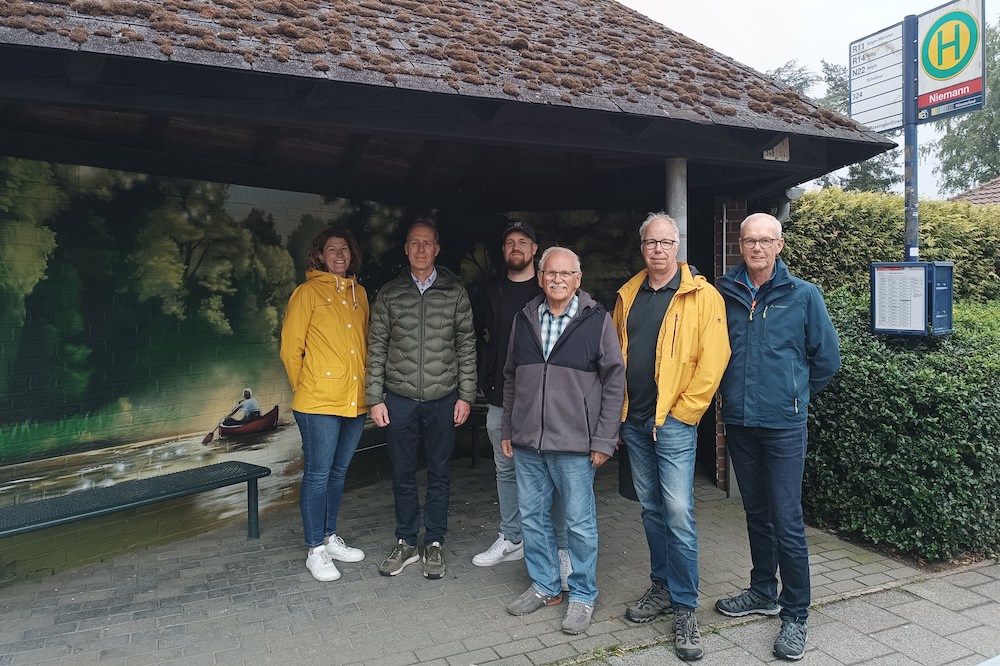 Die Bushaltestelle in Fahrtrichtung Warendorf zeigt fahrradfahrende Personen auf dem Europaradweg R1 (Alter Münsterweg bzw. Emsradweg).