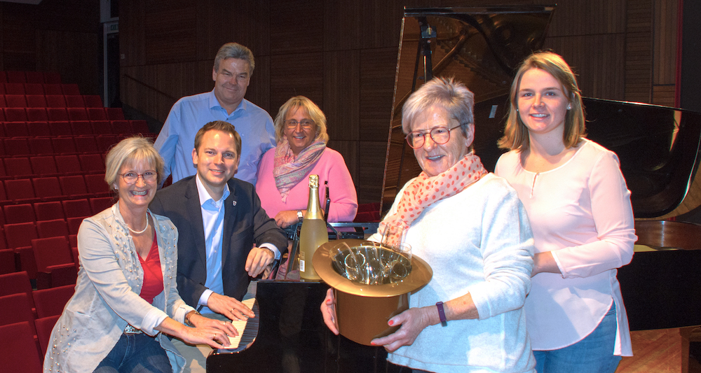 Freuen sich auf die Neujahrsgala in Versmold: Bürgermeister Michael Meyer-Hermann, Bettina Sieckendiek (beide sitzend am Klavier), stehend vor dem Klavier Renate Sieckendiek, Anna-Lea Rinker und hinter dem Klavier Stefan Rinker und Birgit Sieckendiek-Rinker. (Foto: Sieckendiek)