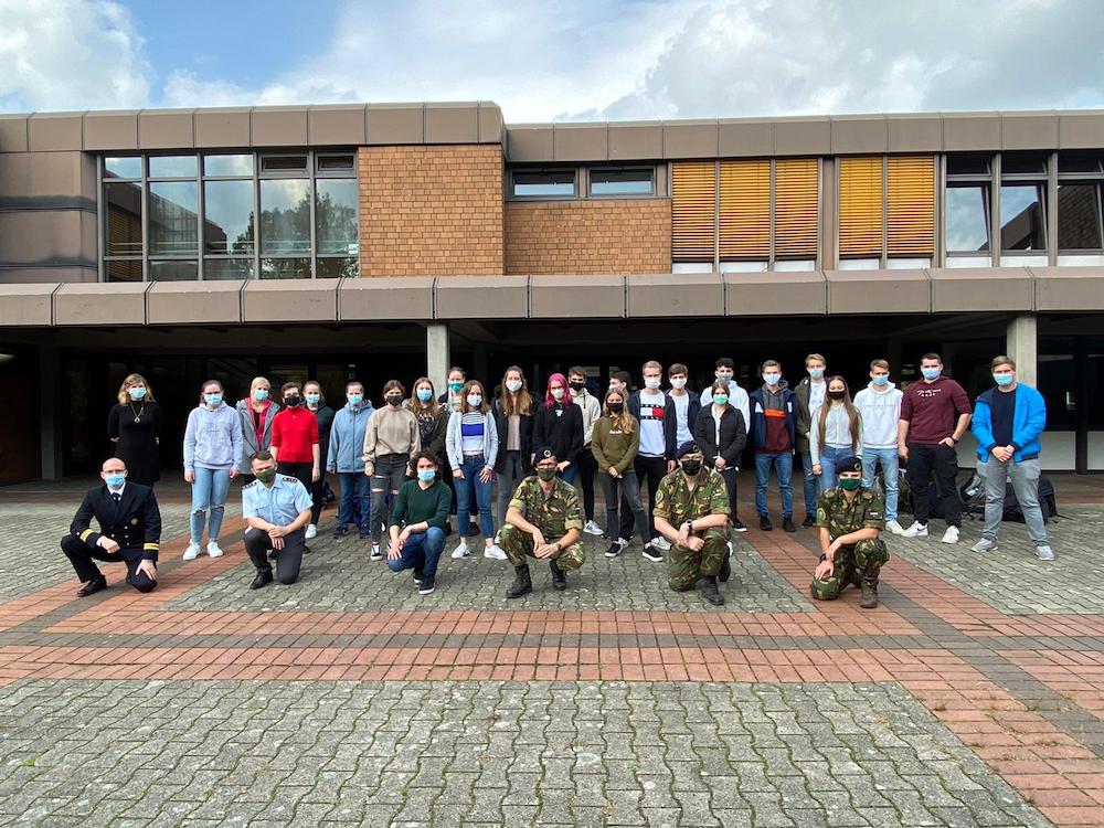 Schülerinnen und Schüler der Niederländisch-Grundkurse von Martina Beuting und Katrin Rippolz sowie Tristan Gayda mit den Soldaten und Offizieren vom Deutsch-Niederländischen Corps (1. Reihe von links nach rechts: Kapitänleutnant Hendrik Siebenmorgen, Hauptmann Roman Hermann, Studienreferendar Tristan Gayda, Captain Stefan Wolczack, Major Leo van der West, Officer Candidate Iris Wetzels).