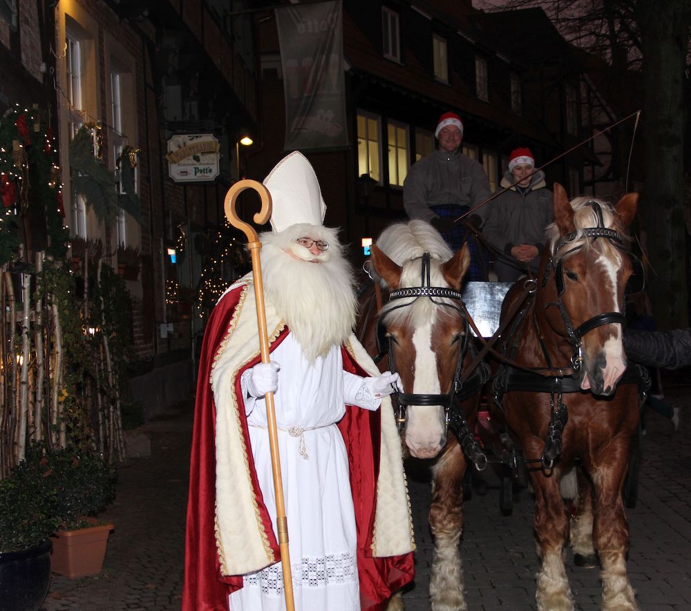 Am Dienstag reist der Nikolaus mit seinem Begleiter Knecht Ruprecht in einer Kutsche vom Nordrhein-Westfälischen Landgestüt an. Nach einer Rundfahrt durch die Stadt kommt das prächtige Gespann, gezogen von imposanten Kaltblütern, um 16.30 Uhr auf dem besonders hergerichteten Kirchplatz St. Laurentius an. Die Fanfare einer Bläsergruppe von der Schule für Musik des Kreises Warendorf schallt ihm erwartungsvoll entgegen.