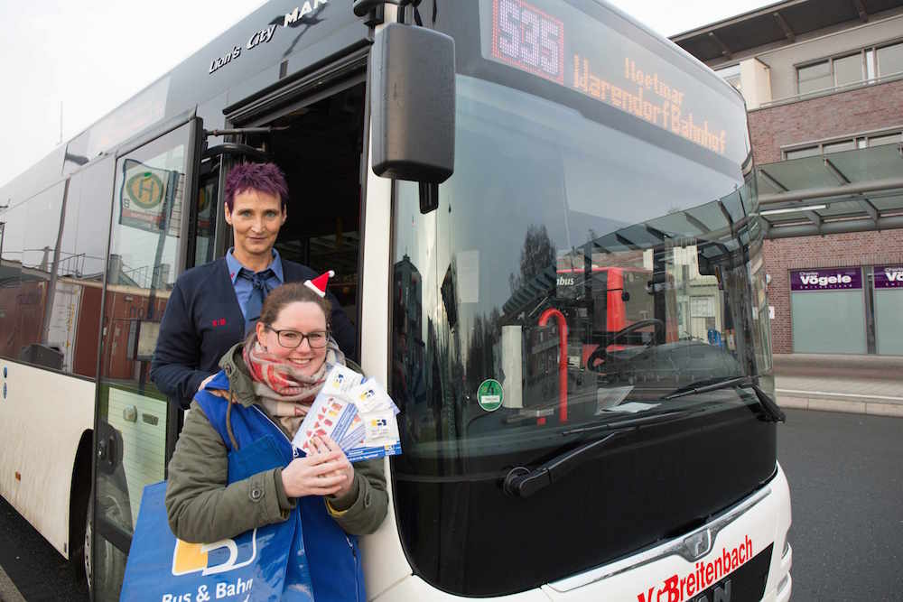 Gute Fahrt mit Nikolauspräsent auf der Buslinie S35: Das Promotionteam für Bus und Bahn im Münsterland überrascht mit einem kleinen „Fahrzeitversüßer“.