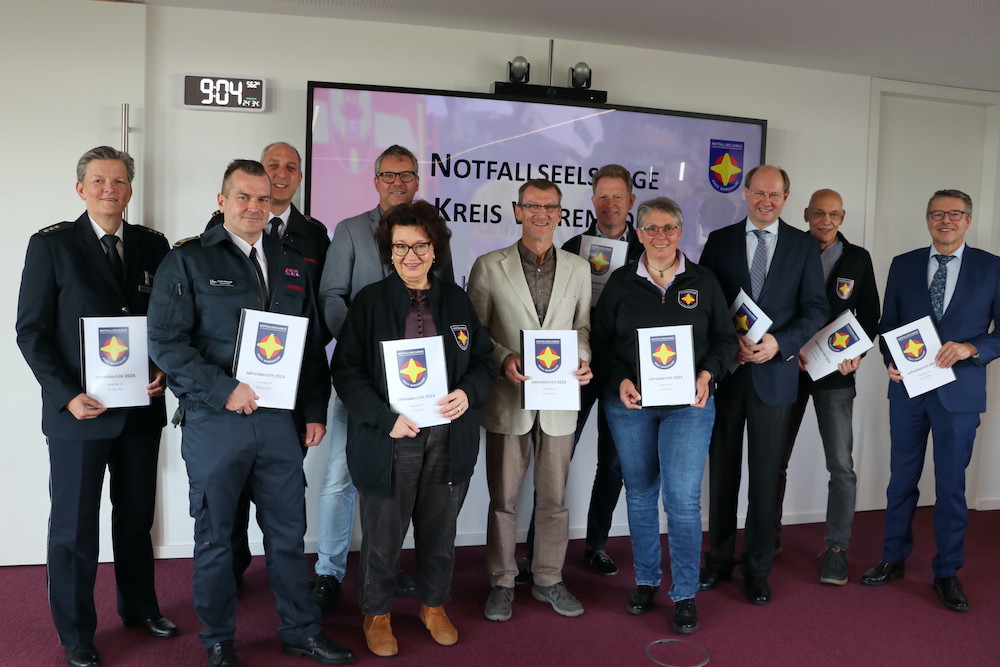 Andrea Mersch-Schneider (v. l.), Patrik Hillebrand, Jens Holtkötter, Michael Frerich, Alexandra Hippchen, Ralf Holtstiege, Martin Remke, Magdalene Brockhinke, Landrat Dr. Olaf Gericke, Martin Kofoth und Kreisdirektor Dr. Stefan Funke bei der Übergabe des Jahresberichts der Notfallseelsorger.