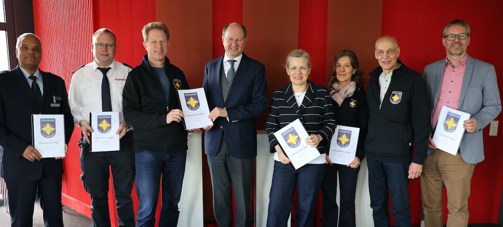 Johannes Schütze (Kreispolizeibehörde Warendorf Direktion Gefahrenabwehr/Einsatz, v. l.), Nils Recker (stv. Leiter der Kreisleitstelle), Martin Remke (Koordinator für die Notfallseelsorge im Kreis Warendorf), Landrat Dr. Olaf Gericke, Ordnungsdezernentin Petra Schreier, Petra Huß (Notfallseelsorgerin), Martin Kofoth (Feuerwehrseelsorger) und Michael Frerich (Amtsleiter Bevölkerungsschutz) bei der Übergabe des Jahresberichts.