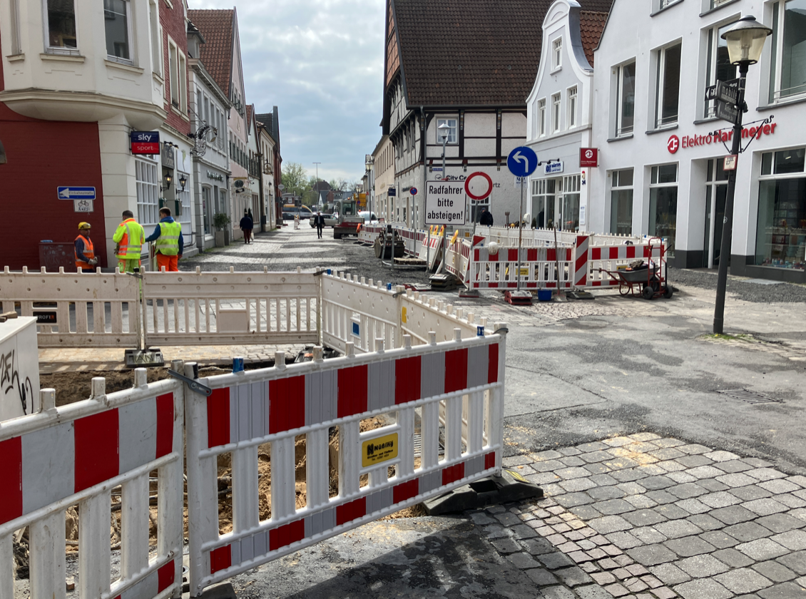 Die Baumaßnahmen zur Umgestaltung der Fußgängerzone schreiten voran. Der erste aufwendige Meilenstein, die Erneuerung sämtlicher Ver- und Entsorgungsleitungen, wird im September 2024 in allen Bereichen abgeschlossen sein. Der folgende Baustein, die Verlegung des geplanten klimaneutralen Wärmenetzes, könnte direkt im Anschluss starten, sofern die dafür notwendigen Fördermittel des Bundes bewilligt werden.
