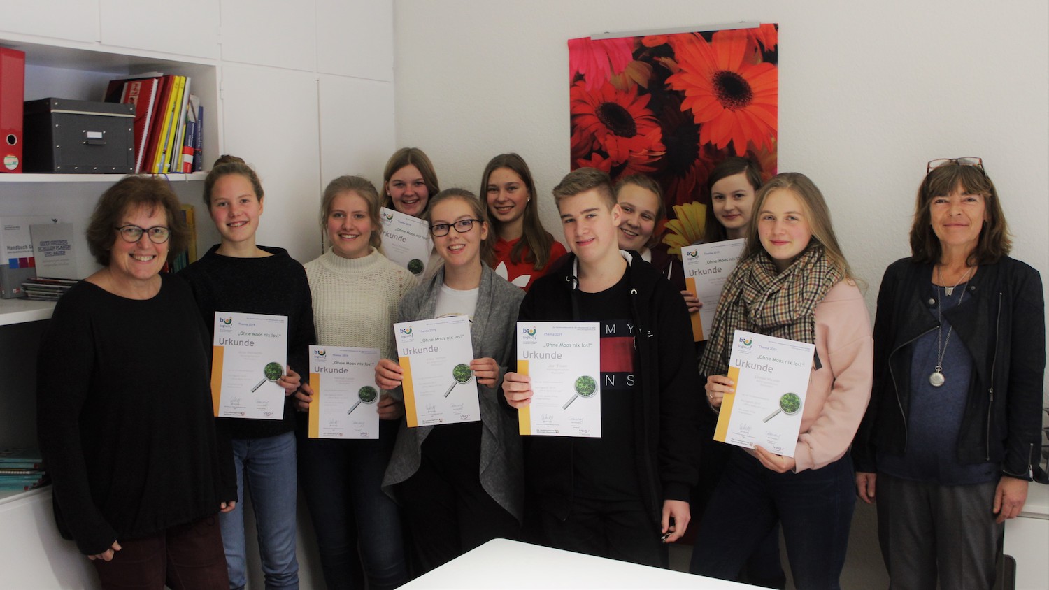Vor den Sommerferien reichten neun Schülerinnen und ein Schüler aus dem Kurs Naturwissenschaften des Jahrgangs 9 des Mariengymnasiums bei Frau Dr. Schöneich ihre umfangreichen Projektmappen zum Thema „Ohne Moos nix los“ für den Wettbewerb „Bio-logisch!“ ein und erhielten nun für ihre erfolgreiche Teilnahme Urkunden. Joel Tissen und Hannah Leson wurde eine besonders erfolgreiche Teilnahme attestiert, da ihnen eine Platzierung unter die Besten ihres Jahrgangs gelang. Die Schülerinnen und Schüler untersuchten für den Wettbewerb mit Lupe, Mikroskop und Binokular Moospflanzen und die verschiedenen Tiere in einem Moospolster, z. B. Asseln. Hiervon wurden detailreiche Zeichnungen angelegt und sich über die Bedeutung der Moose in der Natur und der darin lebenden Kleinstlebewesen informiert. Experimentell erforschten sie, wieviel Wasser trockene Moospflänzchen mit Hilfe ihrer speziell gebauten Zellen aufnehmen können. Der Einzelwettbewerb für Schülerinnen und Schüler fördert die Neugierde an biologischen Fragestellungen und Phänomenen. Neben theoretischen Aufgabenteilen gilt es jedes Jahr auch experimentelle Fragestellungen unter einem Leitthema zu lösen.