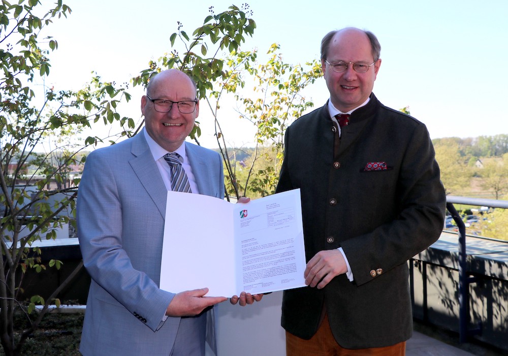 Bürgermeister Karl Piochowiak (l.) erhielt die Freigabe des Haushaltes von Landrat Dr. Olaf Gericke (r.).  Foto: Kreis Warendorf