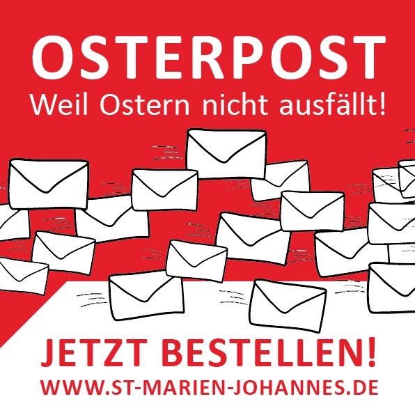 Keine Gottesdienste, keine großen Familientreffen und dennoch fällt Ostern nicht aus. Die Pfarrei St. Marien & Johannes in Sassenberg und Füchtorf bietet dazu die „Osterpost“ an, die bis einschließlich Montag, 6. April bestellt werden kann. In zwei verfügbaren Versionen richtet sie sich an Familien mit Kindern und an Menschen, die das Haus nur noch schwer verlassen können oder wollen. Die Osterpost enthält neben Gebeten, Texten, Bildern zum Ausmalen auch die ein oder andere Überraschung.