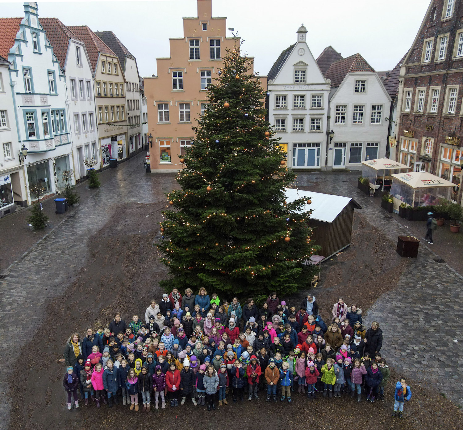 Kurz vor den Weihnachtsferien kamen alle Kinder mit den Lehrkräften zum Marktplatz. Sie erhielten ein kleines Dankeschön für die tollen Schaukästen. Der Besuch wurde in einem Bild vor der wunderschönen Markttanne festgehalten.