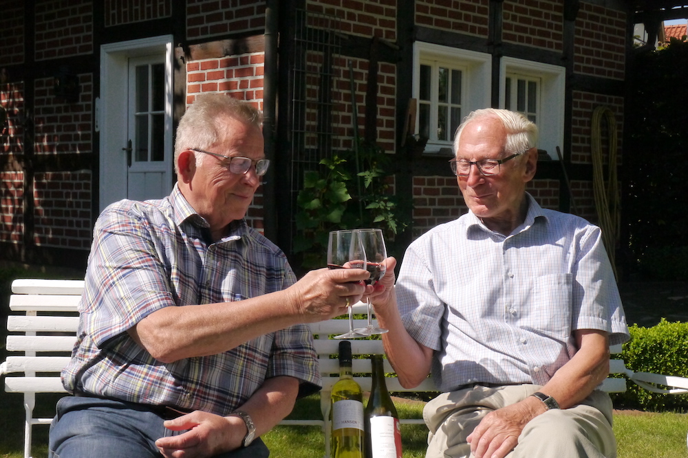 Greifen auch gerne mal zum Weinchen – Franz Wesselmann (links) und Erwin Witulski haben jahrzehntelang auf den Sassenberger und anderen Schützenfesten Bier gezapft