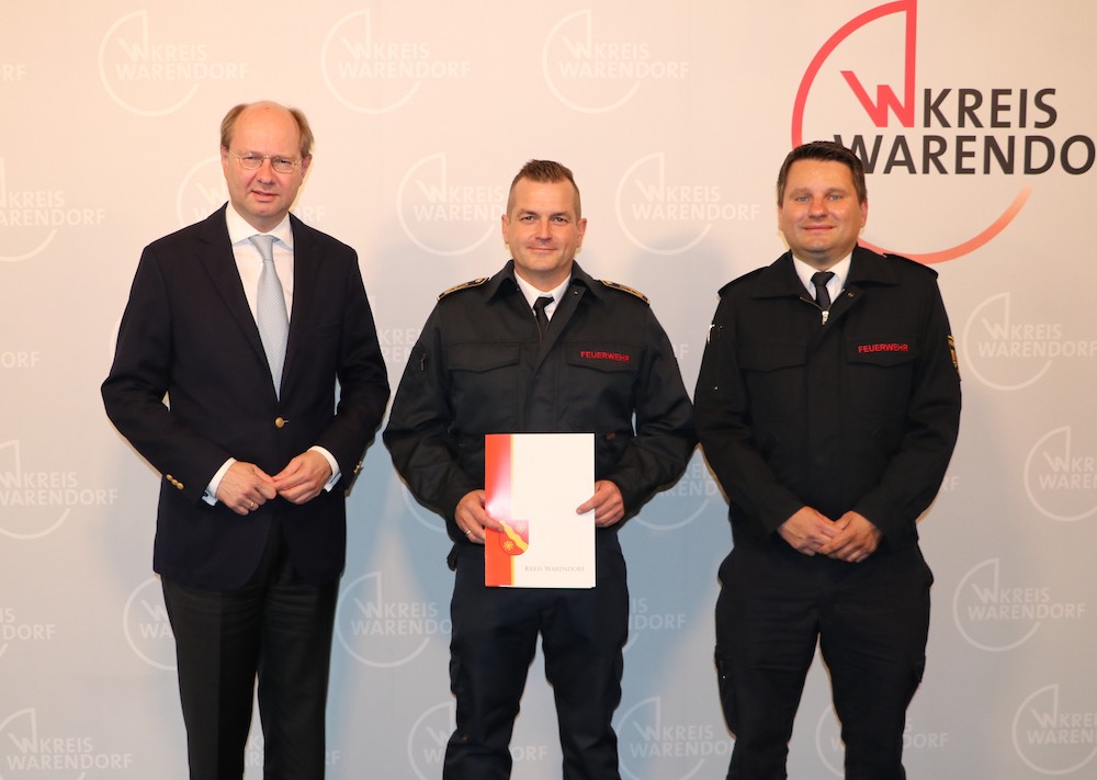 Der neue stellvertretende Kreisbrandmeister Patrik Hillebrand (m.) erhält seine Ernennungsurkunde aus den Händen von Landrat Dr. Olaf Gericke (l.) und dem stellvertretenden Kreisbrandmeister Benjamin Schürholt (r.)“