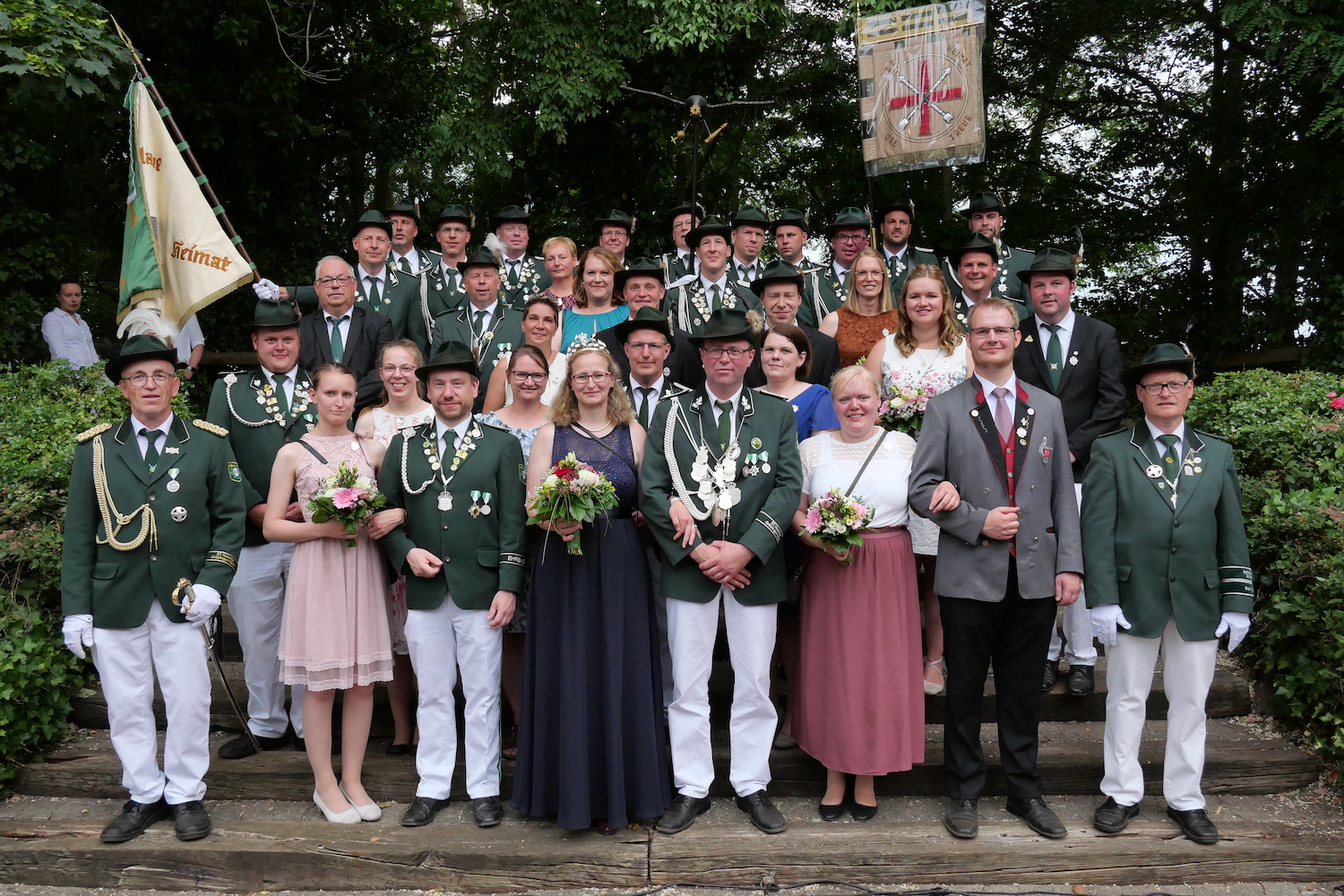 301 Schuss brauchte es, bis Peter Stratmann um 15:51 Uhr als neuer König der Schützenbruderschaft Gröblingen-Velsen fest stand und er seinen Mitbewerber Ralf Grundmeier auf Platz 2 verwies. Aus Stratmanns Familie hatte es in der 60-jährigen Geschichte der Bruderschaft noch keinen König gegeben. Karl Pelster sicherte sich die Krone, Heinz Osthoff den Apfel und Hermann Hülsmann das Zepter. Auf den Thron berief Peter Stratmann, der seine Frau Nadine zur Königin wählte, die Paare Ralf Grundmeier und Sarah Gausepohl, Matthias und Daniela Witte, Michael und Laura Stratmann, Katja Grundmeier und Laurenz Sielaf, Thomas und Manuela Gerlich, Ulrich und Anne Evermann, Christoph und Judith Fartmann, Stephan Stratmann und Sylvia Naschat sowie Stefan und Paula Krümpelmann. (Foto: Joe Rieder)