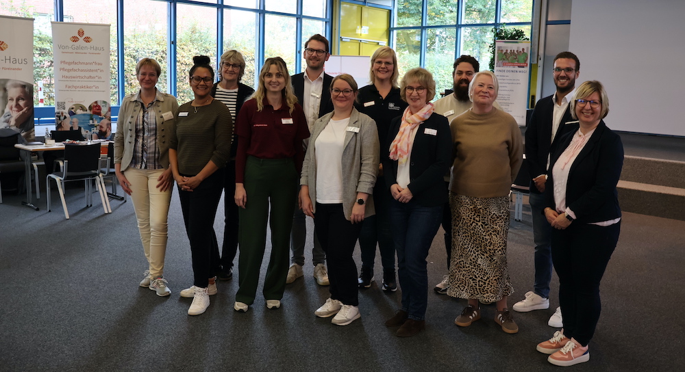 Organisatorin Ulrike Zumbült (v. l. Sozialamt), Kalisha Schindler (Ev. Johanneswerk gGmbH – Julie-Hausmann-Haus), Marita Mense (St. Vincenz-Gesellschaft mbH), Nicole Kupczik (AP Pflegedienste GmbH), Johannes Mersmann (Seniorenzentrum St. Anna), Laura Eggert (Senioren-Park carpe diem GmbH), Sabrina Figgener (Caritas ambulante Dienste GmbH), Birgit Schwichtenhövel (Von-Galen-Haus gGmbH), Jan Guerrero Palma (St. Elisabeth-Hospital Beckum), Melanie Klinge (Agentur für Arbeit), Julian Gösling (Jobcenter) und Amtsleiterin Kirsten Röttger (Sozialamt) sind mit dem Format und den Ergebnissen des Pflege-Speed-Datings zufrieden.