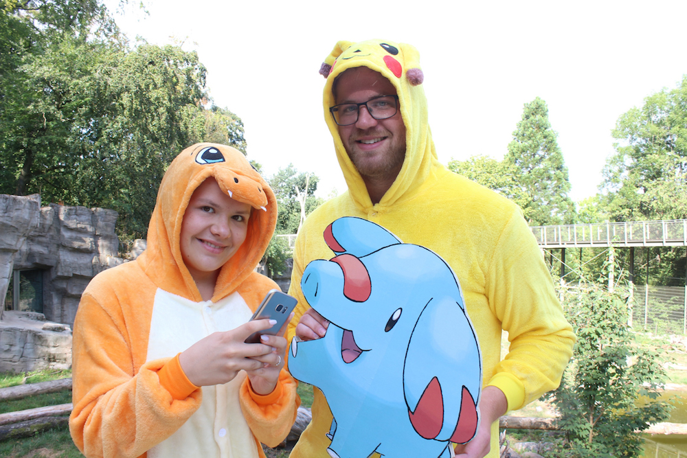 Als „Glumanda“ und „Pikachu“ stimmen sich die Zoomitarbeiter in den passenden Kostümen auf die „SafariZOOne“ am 31.8.2018 im Zoo Osnabrück ein.