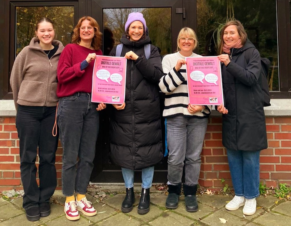 Die Veranstaltung findet am nächsten Donnerstag bei uns im HoT statt. Auf dem Foto sind von links nach rechts zu sehen: Greta Henning und Verena Klesse (beide HoT), Julia Wilpsbäumer( Frauenberatungsstelle Warendorf), Daniela Hornung (HoT), Nina Frye ( Frauenberatungsstelle Warendorf)