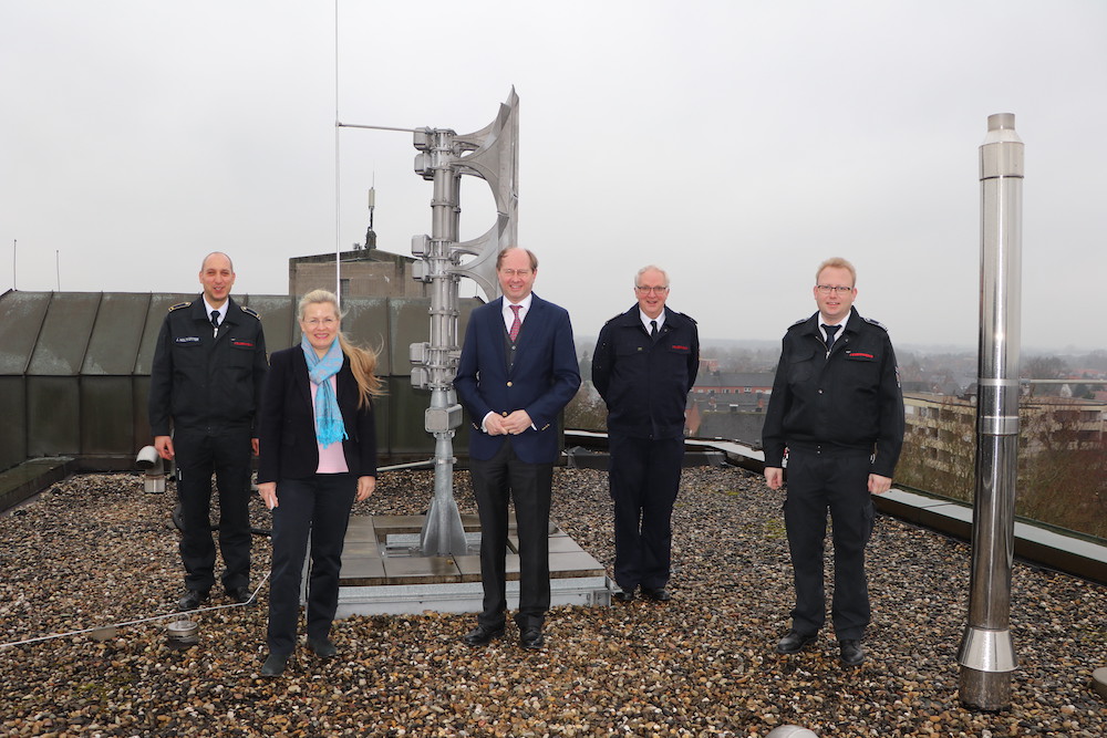 „Landrat Dr. Olaf Gericke (m.) und Ordnungsdezernentin Petra Schreier (2. v. l.) weisen gemeinsam mit Kreisbrandmeister Hans-Jürgen Gottmann (2. v. r.) sowie Leitstellenleiter Jens Holtkötter (l.) und seinem Stellvertreter Lars Recker (r.) auf den kreisweiten Probealarm am 5. Februar um 10.45 Uhr hin.“