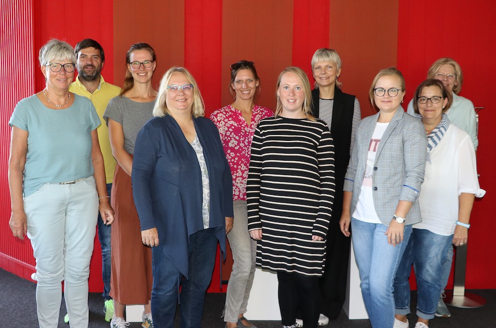 Im Kreishaus in Warendorf trafen sich jetzt die Beteiligten am Projekt „Erzählfreundschaften“ zu einem Austausch. Das Bild zeigt (v.l.) Maria Eilhard-Adams, Marc Schmidt (beide Gemeinde Wadersloh), Angelina Veit (Caritasverband Ahlen, Drensteinfurt und Sendenhorst), Anne-Kathrin Schulte (Ehrenamtskoordinatorin Stadt Sendenhorst), Miriam Muser, Kira Neuhaus (beide ZuM Projekt Dechaneihof Freckenhorst), Sarah Gerke (Ehrenamtskoordinatorin Stadt Oelde), Frauke Santos Sáez (Projekt Muna Ennigerloh), Beate Baldus (Kreis Warendorf) und Annette Wernke (Regionalbüro Alter, Pflege und Demenz Münsterland). – Foto: Kreis Warendorf