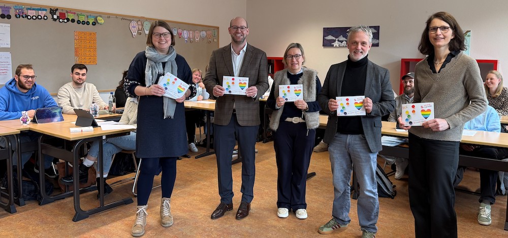 Stellten den Projektkatalog in einer Klasse für angehende Erzieherinnen und Erzieher vor (v.l.): Katharina Wiggering (Referentin für „youngcaritas“), Dr. Ansgar Seidel (Vorstandssprecher des Caritasverbandes im Kreisdekanat Warendorf), Birgit Arlinghaus (Deutschlehrerin), Udo Lakemper (Leiter des Paul-Spiegel-Berufskollegs in Warendorf) und Bianca Schütte (Abteilungsleiterin der Fachschule für Sozialwesen). Foto: Caritasverband im Kreisdekanat Warendorf