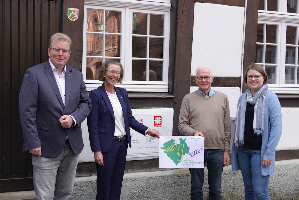 Über eine Spende in Höhe von 4.000 Euro konnte sich der Caritas-Warenkorb in Warendorf freuen. Dr. Katrin Peitz und Rolf Möllmann überreichten die Spende des Vereins „Provinzialer in Westfalen-Lippe helfen e.V.“ an Heiner Schoppmann und Kathrin Wiggering vom Caritas-Warenkorb.