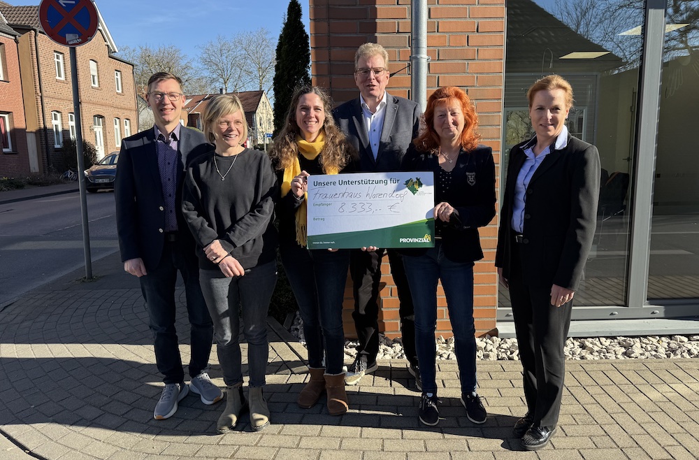 Der Verein „Provinzialer in Westfalen-Lippe helfen e. V.“ unterstützt das Frauenhaus in Warendorf mit einer Spende in Höhe von 8.333,– Euro. Rolf Möllmann (Geschäftsstellenleiter Warendorf), Astrid Hagemeister (Geschäftstellenleiterin Freckenhorst u. Hoetmar) und Anne Wimmersberg (1. Vorsitzende des Vereins „Provinzialer in Westfalen-Lippe helfen e. V.“), überreichten den symbolischen Scheck an Ulrike Greßhake und Kathrin Menke vom Frauenhaus in Warendorf.