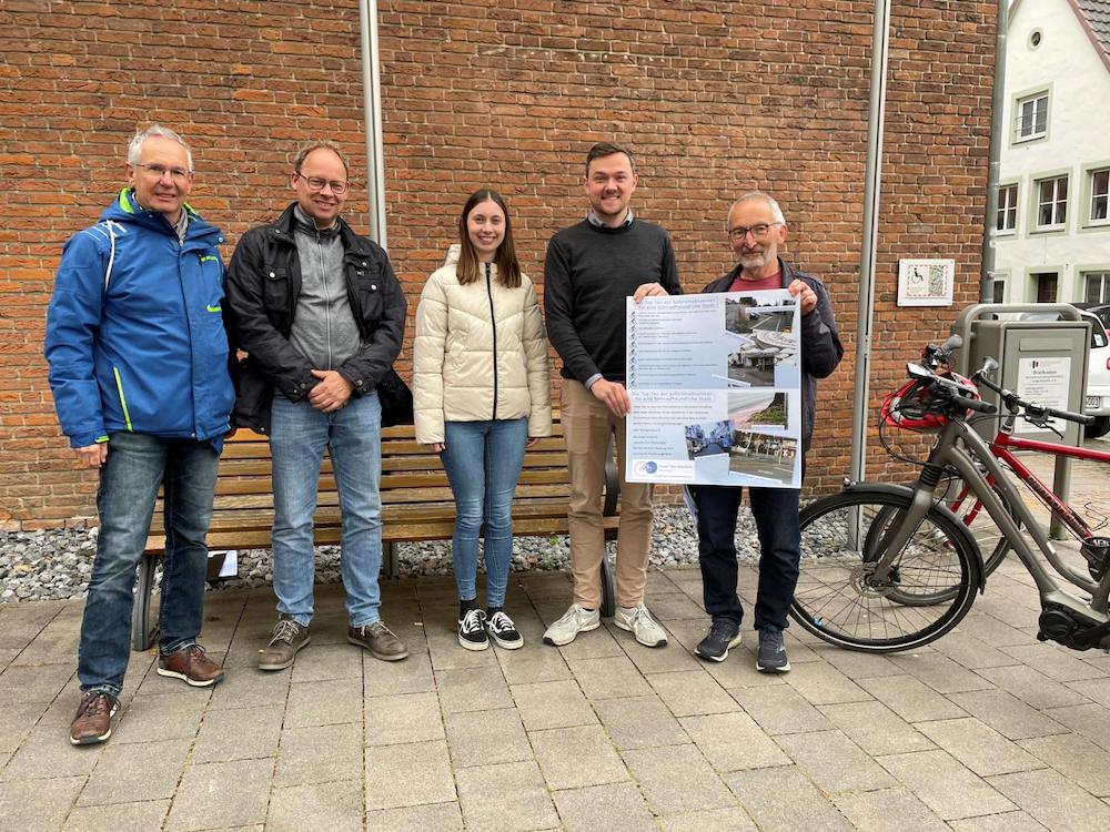 Die zahlreich bebilderten Maßnahmen haben Jürgen Pfeiffer und Gerd Nergert vom RTR in Form eines Plakats an Bürgermeister Peter Horstmann übergeben. „Einige der hier dargestellten Maßnahmen z. B. Angleichungen an Übergängen, die Regulierung von Schachtdeckeln oder der Umbau von weiteren Umlaufsperren sind seitens der Stadt bereits beauftragt und zum Teil auch schon ausgeführt worden. Das Poster bestätigt uns einerseits, dass wir auf einem guten Weg sind, den Radverkehr in Warendorf zu stärken. Andererseits haben wir auch noch einige Baustellen vor der Brust“, bedankt sich Bürgermeister Peter Horstmann für das Engagement des RTR.