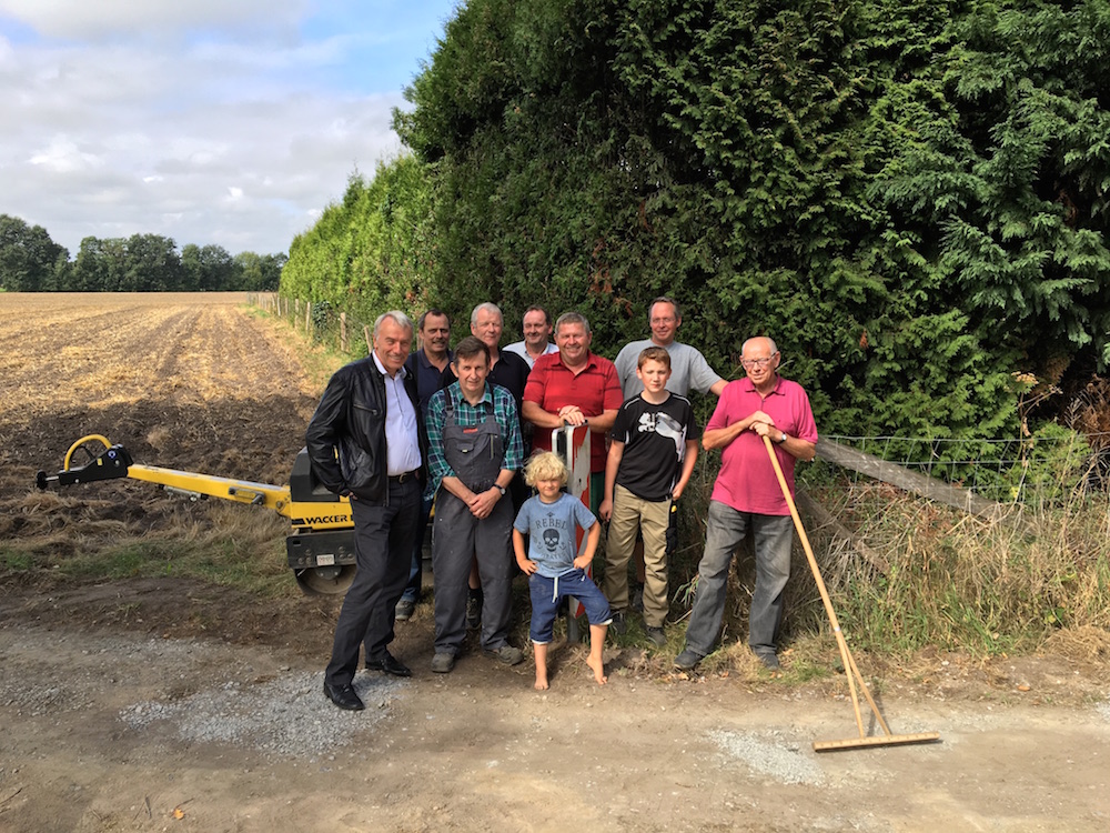 Beelen. Ralf Pomberg, SPD-Vorsitzender in Beelen, hat den SPD-Bundestagsabgeordneten Bernhard Daldrup eingeladen, um die fleißigen Anlieger des Harsewinkler Damms zu besuchen. Sie bauten 2001 den ersten Radweg im Kreis Warendorf durch eigene Initiative. An mehreren Wochenenden renovieren sie „ihren“ Radweg derzeit; in den vergangenen 15 Jahren aber schon zum dritten Mal. Immerhin handelt es sich um rund 1,8 km, die in Eigenarbeit mit einer wassergebundenen Decke versehen, befahrbar gehalten werden. Spenden und Unterstützung der Gemeinde sind die Hilfen, die die Nachbarschaft zur Erledigung erhält. „Sie sind eines der guten Beispiele, die immer wieder zeigen, dass unsere Gesellschaft auch durch Zusammenhalt, gute Nachbarschaft und Engagement geprägt ist“, so Bernhard Daldrup, während Ralf Pomberg mit einer Getränkespende aufwartete, Arbeit macht schließlich auch durstig. Von den damaligen Ankündigungen des Kreises, die Flächen zu erwerben, sei nichts übrig geblieben, erinnern sich die Anlieger an Versprechen früherer Jahre. Leider endet der Radweg an der Grenze zum Kreis Gütersloh auf der Kreisstraße. Trotz solcher Widrigkeiten lassen sich die Anlieger nicht davon abhalten, den auch heute noch gut genutzten Radweg auf Vordermann zu bringen.