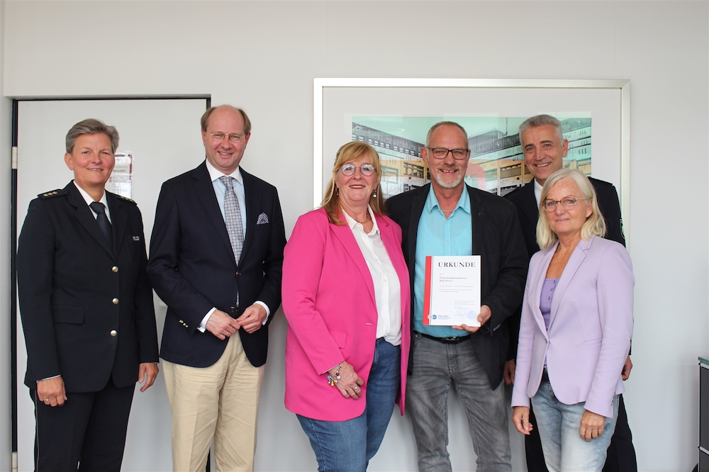 Dr. Olaf Gericke dankte Ralf Drews für seinen Einsatz für die Sicherheit der Bevölkerung in den letzten 43 Jahren und wünschte ihm alles Gute sowie viele gesunde Jahre für den Ruhestand. Die Abteilungsleiterin Polizei, Andrea Mersch-Schneider, die Leiterin Zentrale Aufgaben, Susanne Hassink und Martin Entrup als Personalratsvorsitzender schlossen sich den guten Wünschen an.