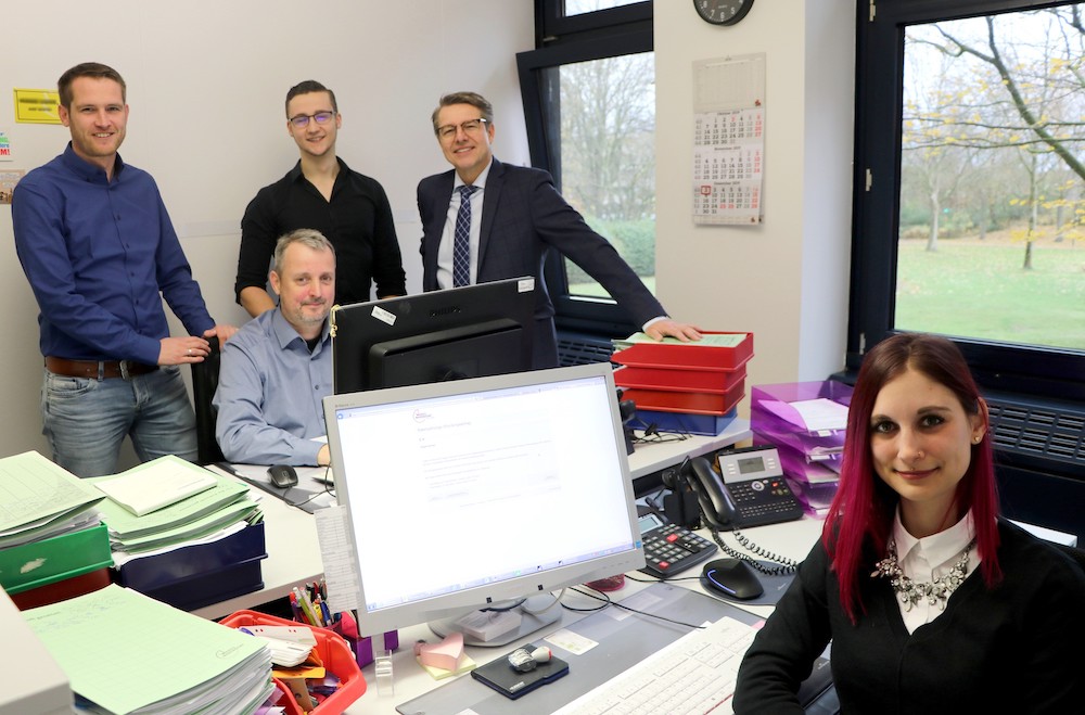 Freuen sich über den neuen Service für Bürger (v.l.): Hendrik Lüffe (Leiter der Finanzbuchhaltung), Jochen Seitz (Sachbearbeiter), Philipp Schröder (IT-Mitarbeiter), Dr. Stefan Funke (Kreisdirektor und Kreiskämmerer) und Jana Kummer (Sachbearbeiterin). – Foto: Kreis Warendorf