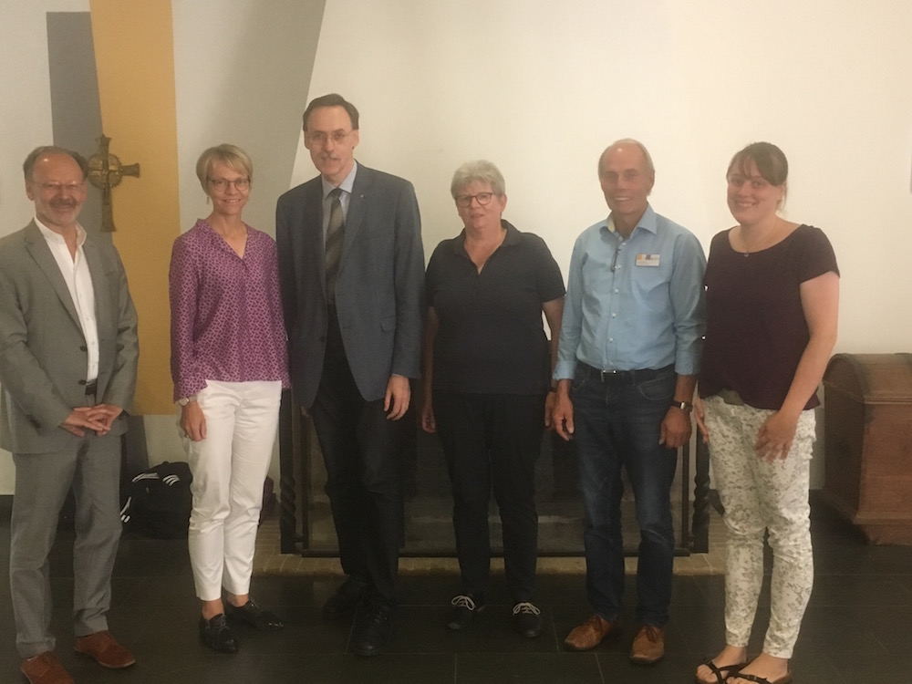 „Die Stärkung des ländliche Raumes, insbesondere des Münsterlandes, wird in eindrucksvoller Weise durch die inhaltlich breit aufgestellte Bildungsarbeit der Katholischen Landvolkshochschule (LVHS) Freckenhorst in den Blick genommen“ – so das Fazit von Regierungspräsidentin Dorothee Feller bei ihrem Besuch in der LVHS. „Als Gesellschaft müssen wir ein Interesse daran haben, dass das Leben auf dem Lande weiterhin blüht, und wir den Herausforderungen von der Demographie bis zur Digitalisierung gewachsen sind“. Dazu trage – so die Einschätzung von Feller – die Bildungsarbeit erheblich bei. Die LVHS Freckenhorst blickt auf über 60 Jahre Erfahrung in der Erwachsenenbildung in Trägerschaft des Bistums Münster zurück. LVHS-Direktor Michael Gennert freut sich, dass die Regierungspräsidentin den bedeutenden Einfluss der Weiterbildungseinrichtungen schätzt und sich die Zeit für ein ausführliches Gespräch über das Programmangebot der LVHS nahm. Gemeinsam mit Kulturdezernent Georg Veit, den beiden LVHS-Fachbereichsleitungen Larissa Rathmer und Josef Everwin sowie Dr. Birgit Marx von der Fachstelle Bildungsmanagement des Bistums Münster diskutierte man die inhaltlichen Schwerpunkte der LVHS vor dem Hintergrund des gesellschaftlichen Wandels. An erster Stelle standen die Angebote für die Lebens- und Arbeitswelt im ländlichen Raum und die bäuerliche Lebenswelt sowie die völlig neuen Anforderungen in der Familienbildung im Geflecht der Generationen. Auch die internationale Arbeit und die politischen Weiterbildungsangebote der LVHS, nicht zuletzt zu Themen der Entwicklung der europäischen Union, kamen ausführlich zur Sprache.