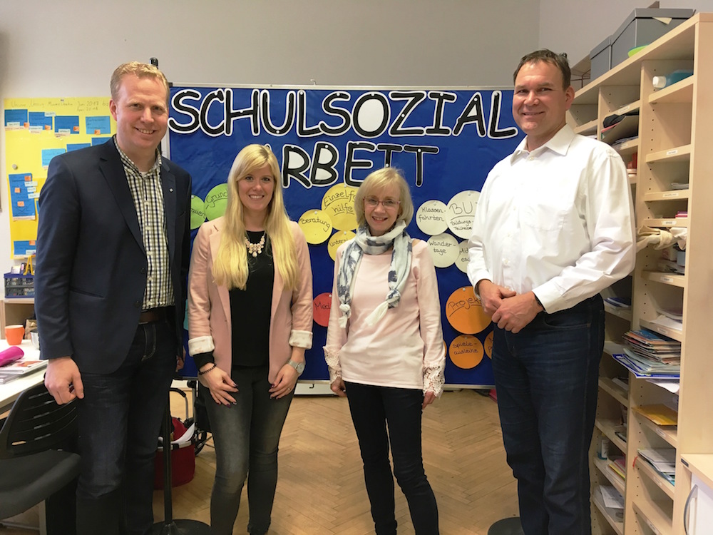 Der heimische CDU-Landtagsabgeordnete Henning Rehbaum besuchte vergangene Woche gemeinsam mit dem CDU- Kreistagsabgeordneten Henrich Berkhoff die Mammutschule in Ahlen um sich bei Schulleiterin Elke Walter und Schulsozialarbeiterin Jennifer Rachuba über die Schulsozialarbeit an der Grundschule zu informieren. Die Schulsozialarbeit ist ein wichtiger Baustein in der Schulpolitik. Die verschiedenen Fördertöpfe auf Bundes-, Landes und auch kommunaler Ebene tragen dazu bei, dass die Schulsozialarbeit in den Schulen funktioniert. Die NRW-Koalition hat bereits die Planungssicherheit für die Kommunen bis 2022 ausgeweitet. Henning Rehbaum nutzte das Gespräch, um eine Sorge von Lehrern, Schüler und Eltern aus der Welt zu schaffen: „Die Schulsozialarbeit ist eine wertvolle Unterstützung für Schüler, Lehrer und Familien. Die CDU/FDP-Landesregierung stellt die Finanzierung der Schulsozialarbeit bis 2022 sicher. 48 Mio. Euro pro Jahr, die bis 2017 befristet waren, stellen wir für die gesamte Legislaturperiode zur Verfügung.“ Moderne Bildung wird demnach nicht nur auf die Vermittlung von fachlichen Fähigkeiten beschränkt, sondern auch die Stärkung von Sozial- und Lernkompetenz fällt in den Bereich der Schulsozialarbeit. Auch Rektorin Elke Walter zeigte sich erfreut: „Ich bin über diese gute Nachricht sehr erleichtert. Schulsozialarbeit lebt von Vertrauen zwischen Sozialarbeitern und Schülern. Dafür brauchen wir Planungssicherheit, die wir jetzt glücklicherweise haben!“