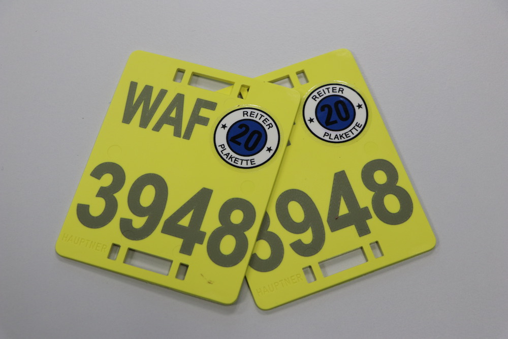 Wer zu Weihnachten eine Reitplakette verschenken möchte, ist beim Kreis Warendorf an der richtigen Adresse. Denn alle, die in der freien Landschaft und im Wald reiten, benötigen nach dem Landesnaturschutzgesetz NRW ein Reitkennzeichen, das beidseitig am Zaumzeug des Pferdes zu befestigen ist. Dabei handelt es sich um zwei gelbe Kennzeichen mit je einer jährlich zu erneuernden Reitplakette. Für das Jahr 2020 werden nur blaue Plaketten mit der Zahl „20“ ausgegeben.