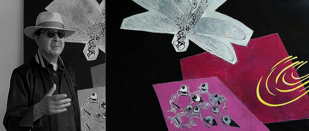 Kanjo Také vor seinem Werk „Water Lily – Dragon Fly“