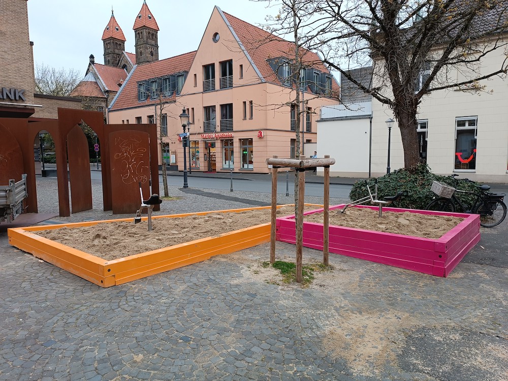 Sandkasten, Buddelkiste und Spielbagger werden über das Förderprogramm des Landes „Zukunftsfähige Innenstädte und Ortszentren NRW“ finanziert.