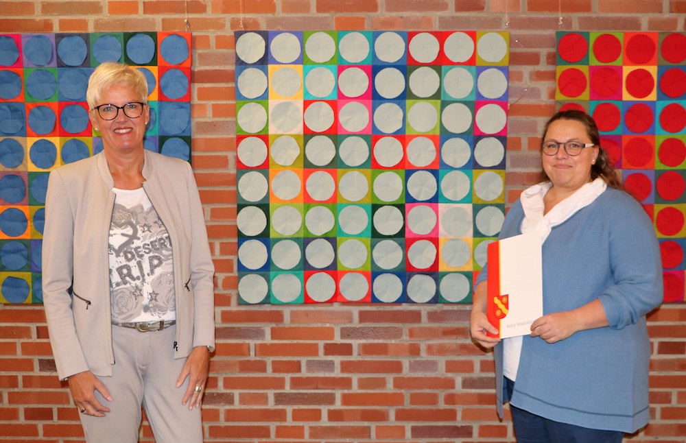 Sandra Franke feierte ihr 25-jähriges Dienstjubiläum. Sozialdezernentin Brigitte Klausmeier gratulierte dazu herzlich. – Foto: Kreis Warendorf