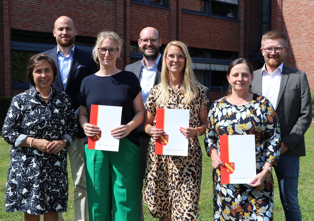 Kamen zur Feier der Dienstjubiläen zusammen: Sozialdezernentin Dr. Anna Arizzi Rusche, Personalamtsleiter Michael Ottmann, Stephanie Schnieder, Jobcenterleiter Dr. Ansgar Seidel, Sarah Loch, Simone Nimz und Personalratsvorsitzender Eugen Harder.