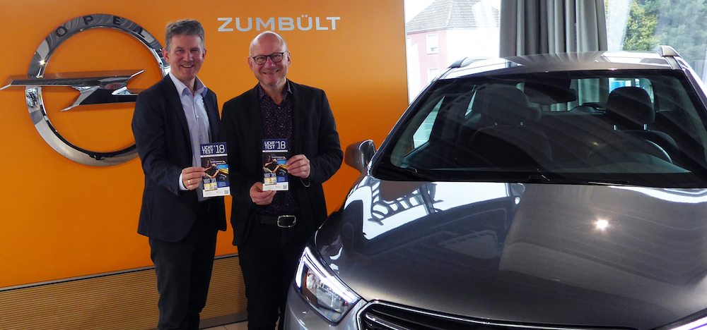 Obermeister Christopher Zumbült und Dr. Peter Wagner vom Innungsservice der Kreishandwerkerschaft Steinfurt-Warendorf laden die Autofahrer zum kostenlosen Lichttest der Kfz-Fachbetriebe der Innung im Oktober ein.