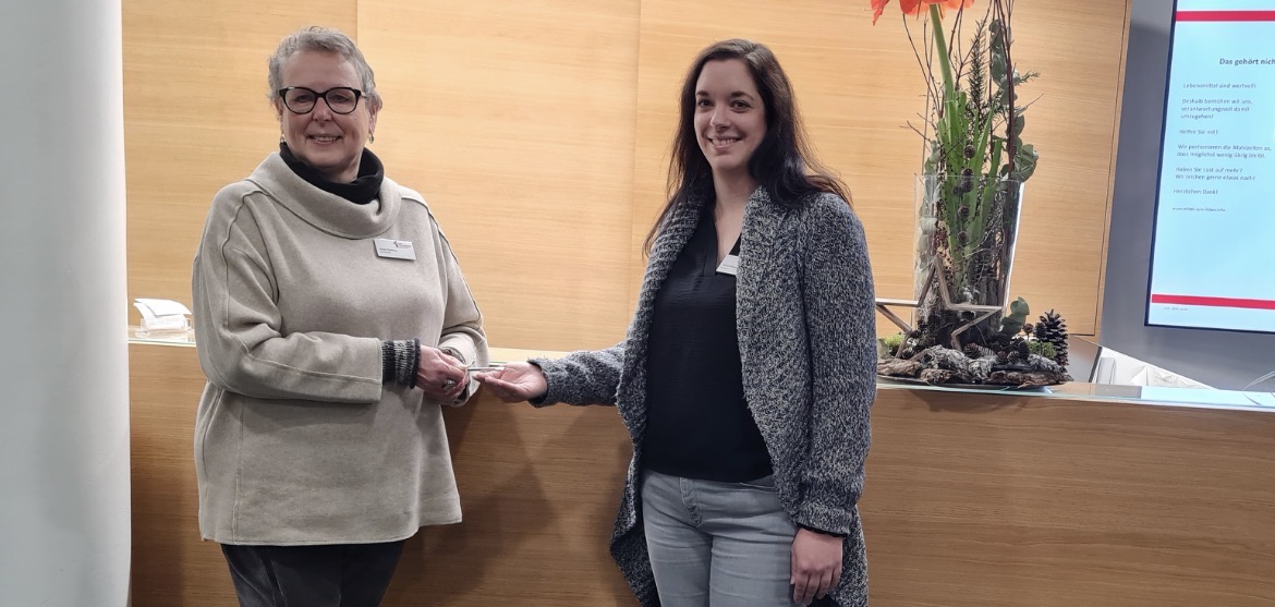 Schlüsselübergabe an der Rezeption der LVHS Freckenhorst: Birgit Mehling (links) mit ihrer Nachfolgerin Michelle Wagener (rechts).