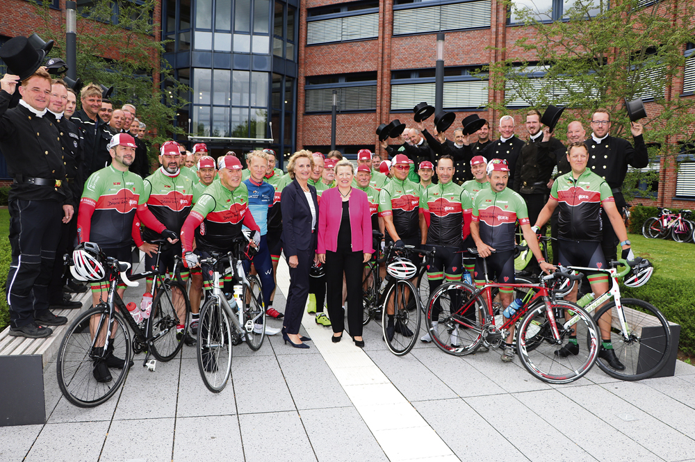 Spalier für die radelnden Kollegen standen 20 Schornsteinfeger aus dem Kreis Warendorf, als die Glückstour – eine Benefiz-Aktion des Schornsteinfegerhandwerks, am Kreishaus Station machte. Empfangen wurden die Fahrer, darunter auch die prominenten Ex-Radprofis Fabian Wegmann (blaues Trikot) und Erik Zabel (4. Fahrer  v.r. im Radtrikot) von Petra Schreier  (Kreisordnungsdezernentin) und Doris Kaiser (stellv. Bürgermeisterin, l. in der Bildmitte). – (Foto  Kreis Warendorf)