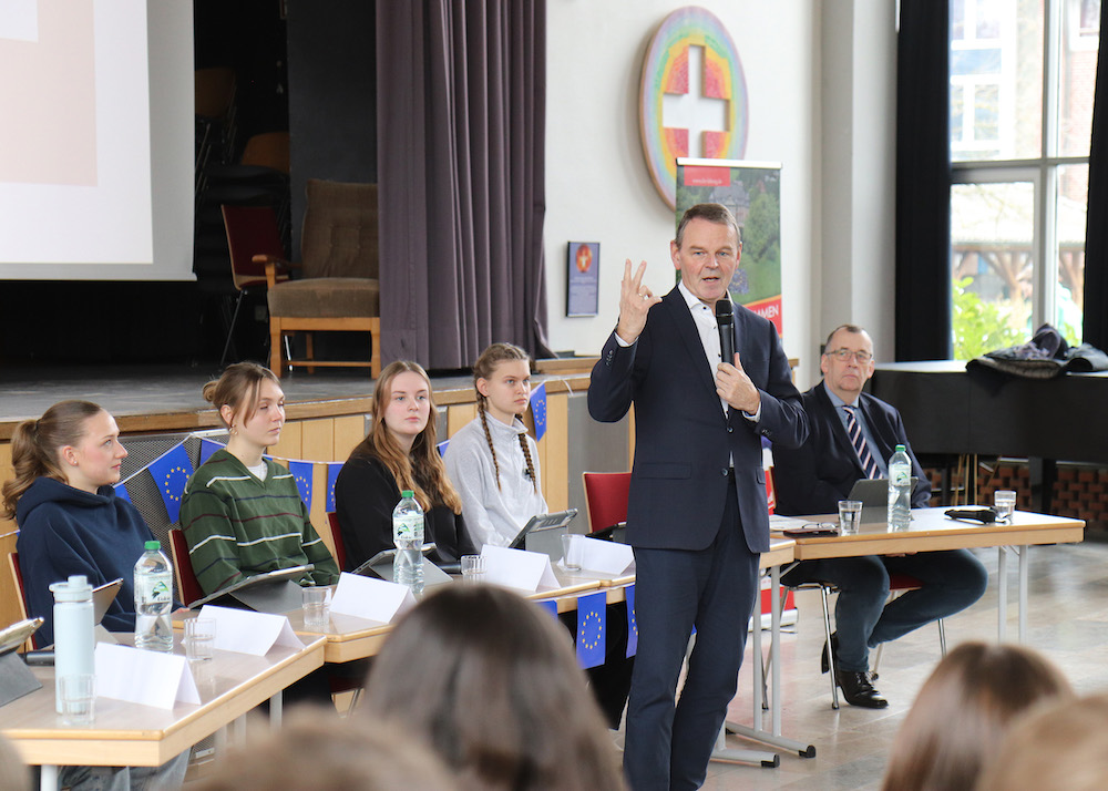Ostbevern. – Ob es um Wirtschaft, Sicherheit, Migration, Verteidigung oder Klimaschutz geht, in diesen und weiteren Fragen „wird die Bundestagswahl entscheidend, sie wird ihr Leben berühren“: Dies betonte Dr. Fritz Jaeckel gegenüber Schülerinnen und Schülern der Jahrgangsstufen Q2, EF und 10 auf der Loburg in Ostbevern. Anlässlich des Europatags hatte das Gymnasium den Hauptgeschäftsführer der IHK Nord Westfalen zur Podiumsdiskussion eingeladen. Zwei Stunden lang tauschte sich Jaeckel mit den gut informierten und gut vorbereiteten Jugendlichen aus, oft mit Blick auf die bevorstehende Wahl, immer aus einer europäischen Perspektive. „Werden Sie politisch aktiv, setzen Sie sich ein, vertreten Sie Ihre Positionen“, appellierte er.