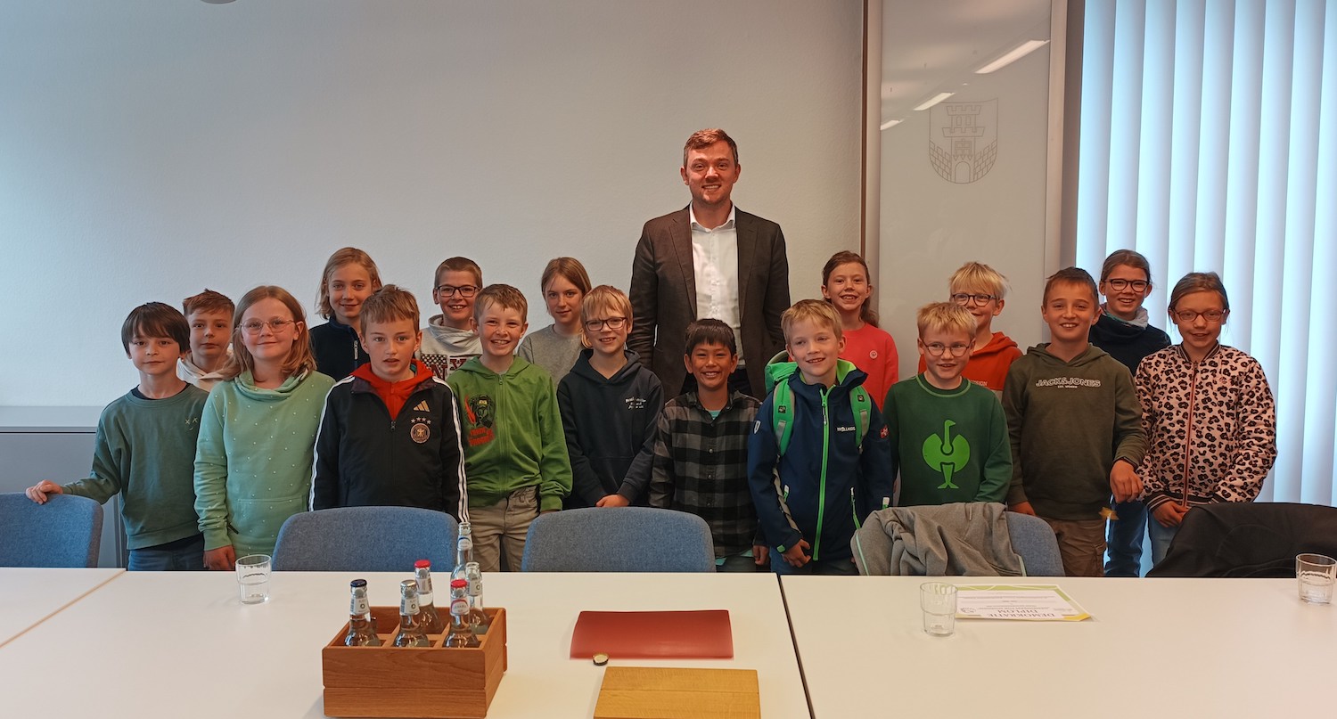 Nach einem Besuch im historischen Rathaus empfing Bürgermeister Peter Horstmann die jungen Gäste anschließend in der Stadtverwaltung. In einem offenen Gespräch beantwortete er zahlreiche Fragen rund um seine Aufgaben, den Alltag in der Kommunalpolitik und die Bedeutung von Beteiligung und Mitbestimmung. Die Fragen gingen dabei von Horstmanns Lieblingstier (Frosch) über die Anzahl der zu leistenden Unterschriften pro Tag bis hin zu konkreten Nachfragen in Sachen Spielplätze in Freckenhorst. Dabei stellten die Jungen und Mädchen fest, dass einer ihrer Lieblingsspielplätze – der an der Peter-Stoffels-Straße – auch der Lieblingsspielplatz von Peter Horstmann als Kind war.