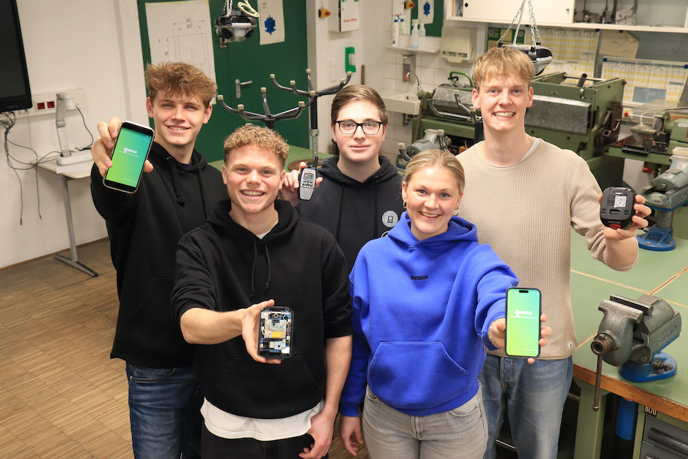 Das Trio aus dem Kreis Warendorf und ihre Mitstreiter vom Hans-Böckler-Berufskolleg qualifizierten sich mit einem starken 16. Platz für das Halbfinale der besten 30 Teams. Nicht nur sie ärgern sich, wenn sie durch leere oder unauffindbare Akkus ausgebremst werden. Eine Blitzumfrage unter Unternehmen hat ergeben: „Fast alle kennen das Problem“, so Benedikt Ueding. Ob Stichsäge, Schrauber oder das Baustellenradio, oft fällt erst am Einsatzort auf, dass der Akku nicht geladen ist. Die Lösung ist ein Trackingchip im Stromspeicher, über den Ladestand und Position ans Smartphone gemeldet werden. „Schon vor der Abfahrt zur Baustelle ist direkt erkennbar, wie voll die Akkus sind und wo sie sich befinden“, erklärt er. Dies erleichtert das rechtzeitige Laden, erhöht die Lebensdauer der Akkus und schont damit die Umwelt. KI soll die Akkunutzung analysieren und Prognosen abliefern, wie lange der Strom für bestimmte Arbeiten reicht. „Außerdem erschwert das Ortungssystem Diebstähle“, nennt Lucy Fellhölter einen weiteren Nebeneffekt.
