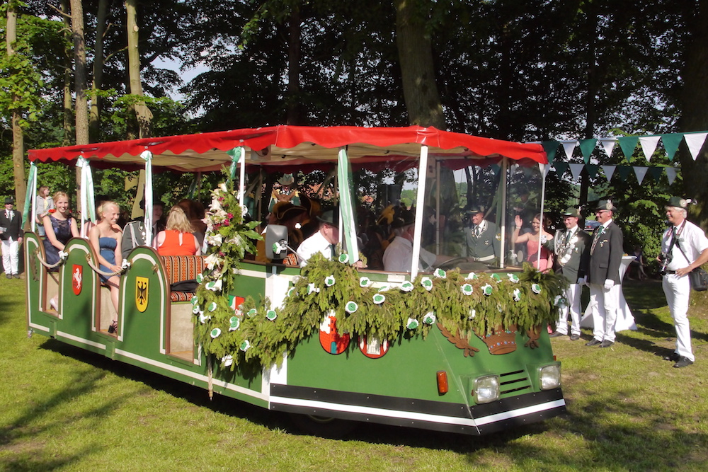 Auch den Sonntag verbringen die Milter Schützen eher etwas zurückhaltend – bislang jedenfalls. Doch der Abend verspricht eine Neuerung – aber dazu später. Zunächst einmal ist alles so wie immer wenn gerade kein Jubiläum ansteht. Um 14:30 Uhr versammeln sich Kinder und Eltern, Musiker, Ehrengarde und Schützen – selbstverständlich in Schützenuniform – auf der Dorfstraße und marschieren von hier mit Musik zum Geißberg, wo das Kinderschützenfest auf dem Programm steht das um 15:00 Uhr beginnt. Eine große Kinderbelustigung, die Verlosung, die Kaffeetafel und das Hampelmannschießen sorgen für einen bunten Nachmittag. Gegen 17:00 Uhr soll das Kinderkönigspaar gekrönt werden und nach der Verteilung einer süßen Überraschung startet die Kinder-Disco. Daran schließt sich ein gemütliches Zusammensein mit Musik und Tanz, Weinstand, Longdrinkbar und vielem mehr auf dem illuminierten Schützenplatz an. Beim „Heide(n)spaß auf dem Geißberg“, wie es im Programm heißt, sorgt DJ Andreas für die musikalische Unterhaltung.