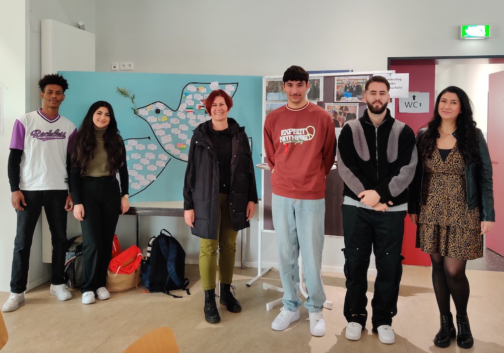 Filmon Misgna, Sabina Yusibova, Schulsozialarbeiterin Kerstin Lienkamp, Ahmet Türer, Ferhat Yavuz und Lehrerin Hülya Özmen (v.l.) vom Berufskolleg Ahlen nahmen am Netzwerktag Schule ohne Rassismus – Schule mit Courage teil.
