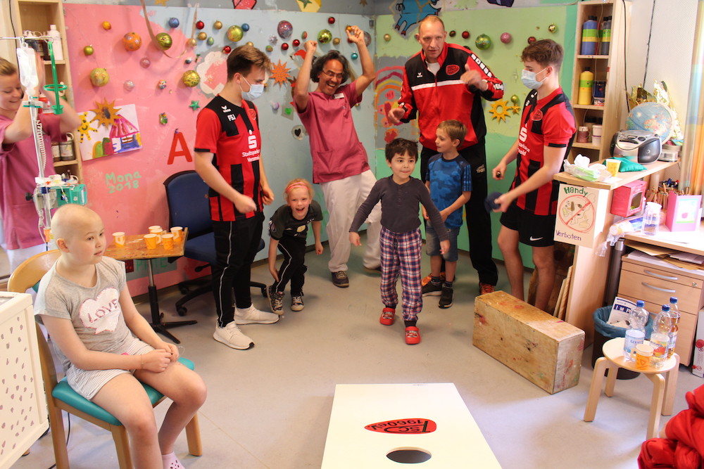 Als Joel Hens Santos und Niklas Siems, die beim SC-Peckeloh ihr Freiwilliges Soziales Jahr (FSJ) absolvieren, ein Cornhole-Brett im Stationsflur aufstellten, scharten sich gleich mehrere junge Patienten und die Kinder des SCP drumherum und probierten es gemeinsam aus. „Die Kinder hier auf der Station müssen mit anderen spielen, sie sollen lachen, tanzen, Musik machen. Denn alles, was uns Kraft gibt, macht uns gesund“, meinte Rodrigo Barros Medina, Ergotherapeut auf K8. Zusammen mit seinen Kolleginnen betreut er rund 60 krebskranke Kinder im Alter von wenigen Wochen bis zu 18 Jahren auf der Station.