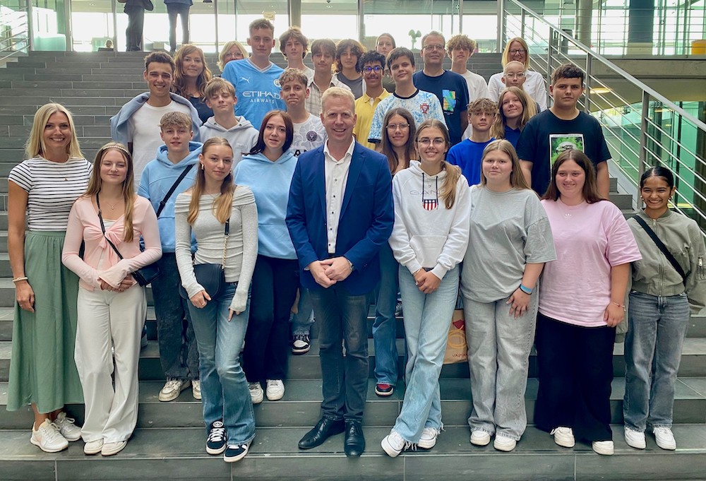 Berlin/Telgte. Mit einer großen Gruppe waren die Schülerinnen und Schüler der Sekundarschule an der Marienlinde aus Telgte nach Berlin gereist, um dort im Rahmen der Abschlussfahrt auch ihren heimischen Bundestagsabgeordneten Henning Rehbaum zu treffen. Im Gepäck hatten sie viele Fragen zu politischen Themen aber auch zum Leben als Berufspolitiker. Nach dem Henning Rehbaum sich kurz vorgestellt hatte, konnten die gut vorbereiteten Besuchergruppen mit dem Bundestagsabgeordneten direkt ins Gespräch kommen. Dabei fiel sofort auf, wie vielfältig die Interessen waren: Es ging von Rechtsextremismus und der AfD im Bundestag bis hin zu Wirtschafts- und Verteidigungspolitik.