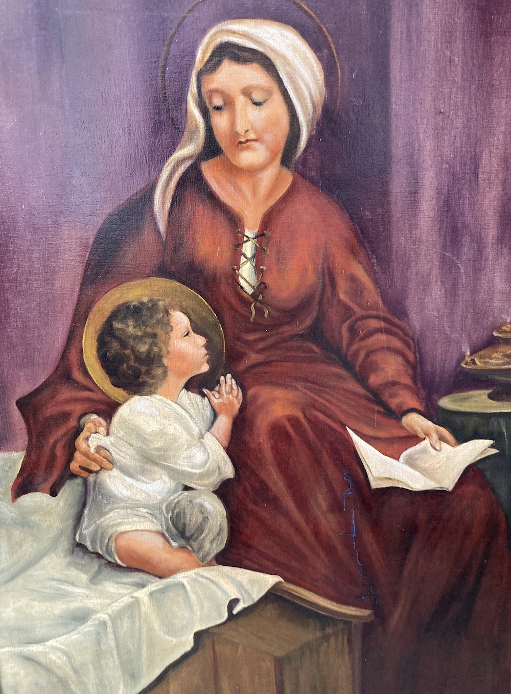 Im Januar 2023 wurde dieses Bild in einer Garage in Warendorf entdeckt und der Sammlung Maria ImPuls der Zeit geschenkt. Gemalt wurde es vermutlich zu Beginn des 20. Jahrhunderts. Es hatte im Laufe der Zeit Schaden genommen. Ein großer Riss zog sich durch die Mitte. Die Signatur H.Vennefrohne war kaum zu erkennen. Vennefrohne zeigt Maria in einem häuslichen Umfeld mit Jesus als Knaben und einem leeren Blatt Papier in der Hand Mariens. Er verweist auf zwei Verse im Lukasevangelium, auf Jesus als „unbeschriebenes Blatt“ in seiner Kindheit und auf die Haltung seiner Mutter: Maria bewahrte alles, was geschehen war, in ihrem Herzen. Wolfgang Götting hat die Leinwand fachmännisch restauriert und die Malerei gründlich gereinigt. Nun erstrahlt das Bild in neuem Glanz, aber ungeklärt bleibt die Frage: Wer war H. Vennefrohne? War er ein Künstler aus Warendorf oder Westfalen? Zu dieser Frage sucht Reinhold Berger für die Sammlung “Maria ImPuls der Zeit” Antworten. Dieses Bild wird zum Fest Mariä Himmelfahrt im Fenster des Quartiersbüro Altstadt Warendorf am Krickmarkt 13 gezeigt. Über Informationen zu dem Bild und dem Maler H. Vennefrohne freut Reinhold Berger sich.