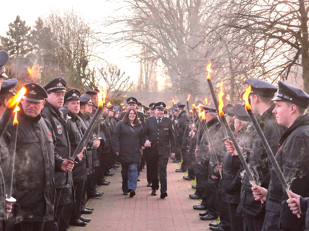 Mit einem Fackelspalier geleiteten die Kameraden Lars und Annika Recker von ihrem Zuhause zu Reckers „eigentlichem Zuhause“ dem Feuerwehrgerätehaus
