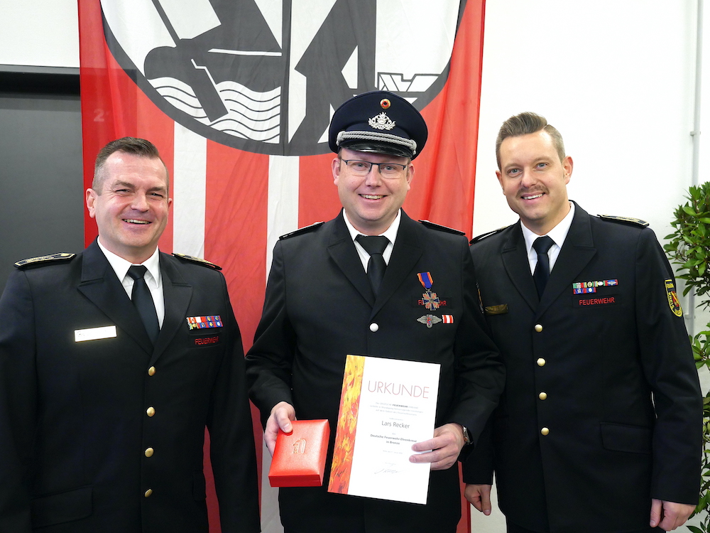 Ausgezeichnet! Patrik Hillebrand überreichte Lars Recker das Feuerwehr-Ehrenkreuz in Bronze des Deutschen Feuerwehrverbandes (DFV),  Hendrik Roggenkamp zeichnete ihn mit der Goldenen Ehrennadel des Kreisfeuerwehrverbandes Warendorf aus (von links)