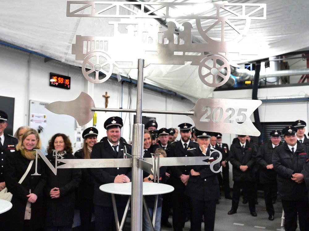 Damit er weiß woher der Wind weht, hatten ihm die Wehrleute diesen sehr persönlichen Wetterhahn mitgebracht